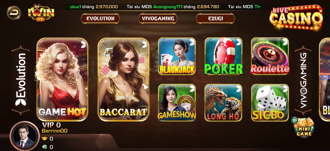 Sảnh live casino IWIN không chỉ nổi tiếng với không khí sôi động mà còn là nơi hội tụ nhiều trò chơi casino đỉnh cao. Dưới đây là các trò chơi bạn không nên bỏ lỡ: